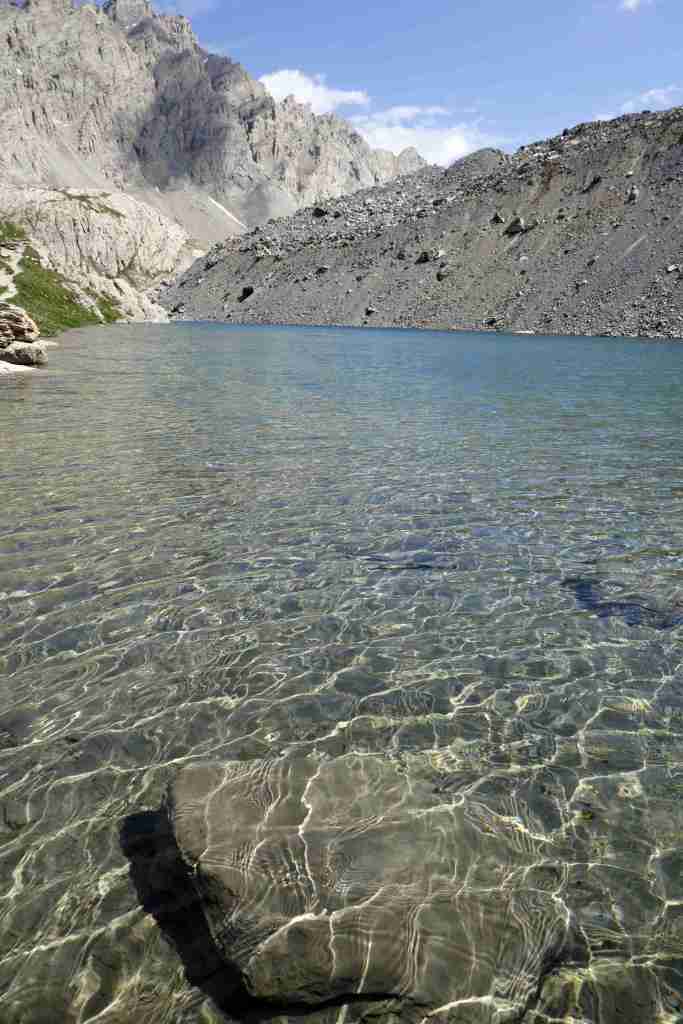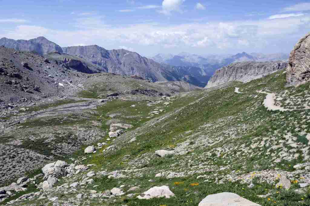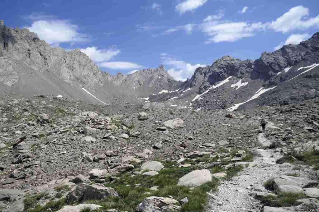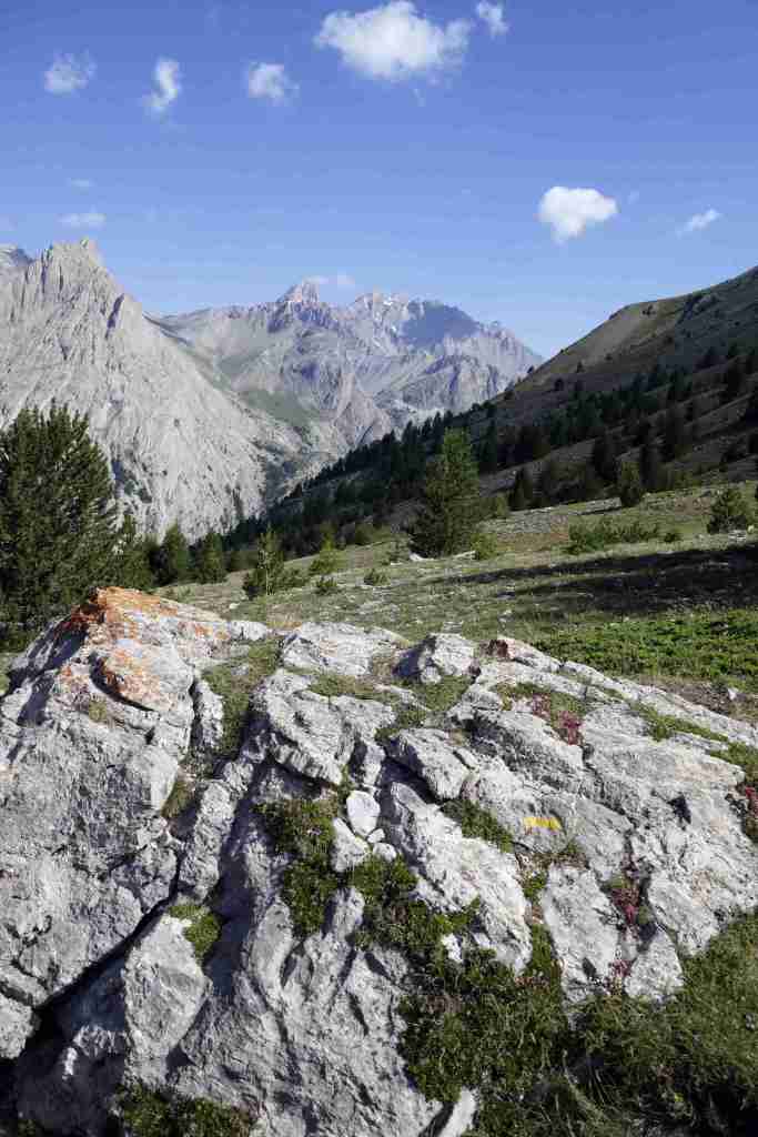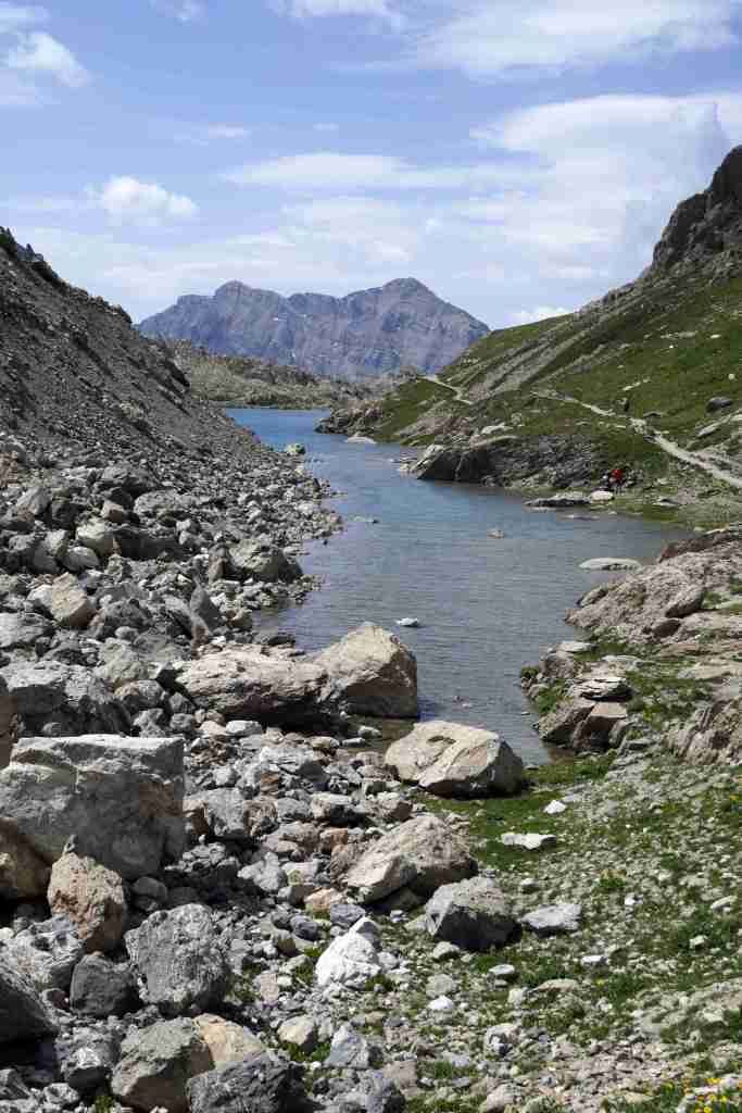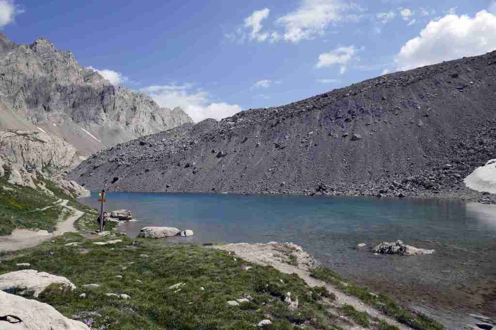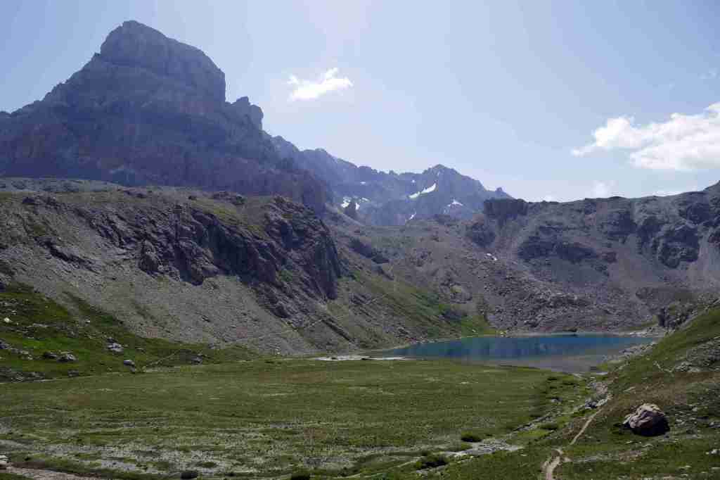 Départ donc de Fouillouse et ses façades ponctuées de cadrans solaires, témoignant de l’ensoleillement important du secteur. Le chemin s’élève rapidement sur un versant adret, avec des vues s’ouvrant sur la Mortice et même les pics de la Font Sancte, plein nord. Ensuite, on bifurque vers l’est en direction du refuge de Chambeyron. Le sentier domine alors le vallon du riou de Fouillouse, au sud. Le refuge est positionné sur les hauteurs du lac Premier, au pied du massif Brec de Chambeyron. L’objectif suivant est le lac Long, situé 1,5 km avant le fameux lac des 9 couleurs, blotti dans un cirque créé par plusieurs sommets dépassant les 3000 mètres, dont l’aiguille de Chambeyron, toit des Alpes-de-Haute-Provence. Grandiose. Le retour se fait par le même chemin jusqu’au lac Long, où l’on part plein sud en direction du Pas de la Couletta. Après un secteur très minéral, on arrive dans le verdoyant vallon des Aoupets. 400 mètres après la cabane du même nom, on tourne vers le nord-ouest et l’on rejoint le curieux fort de Plate Lombarde (ouvrage de la ligne Maginot), depuis lequel on regagne aisément le hameau de Fouillouse.