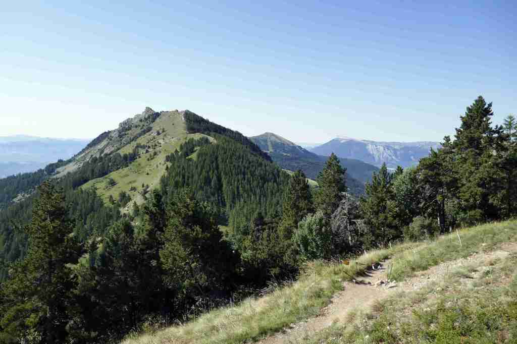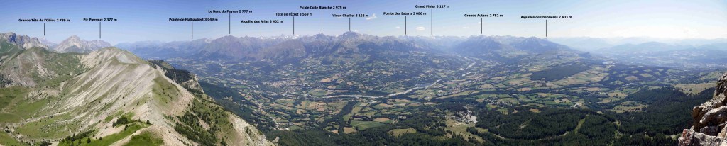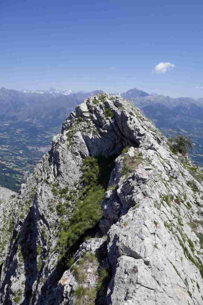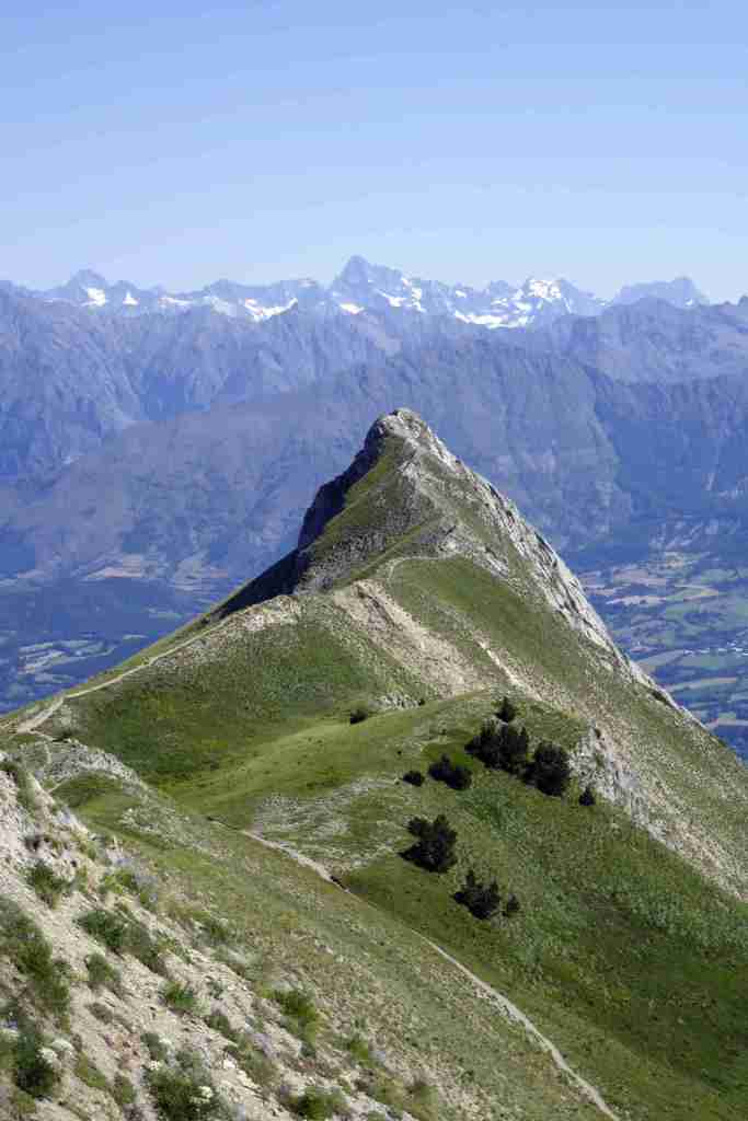 Premier objectif donc, le Pic de Gleize, que l’on rejoint après 2,4 km. D’ici, on distingue bien la géologie calcaire du massif du Dévoluy à l’ouest, qui teint de blanc toutes ses montagnes, dont le caractéristique plateau de Bure. Au nord-est, quelques sommets des Ecrins apparaissent au loin : l’Olan, le Vieux Chaillol, le Sirac… Le Pic de Chaudun, situé à seulement 400 mètres à l’ouest du Pic de Gleize, s’atteint très rapidement via une très esthétique crète. Certaines installations de la station de SuperDévoluy sont visibles. Enfin, pour se rendre au Pic de l’Aiguille, direction le nord-est sur environ 1,3 km. Juste avant d’arriver au sommet, un « pas » vertigineux est à franchir. Le belvédère sur le bocage Champsaurin, le village de Saint-Bonnet-en-Champsaur en contrebas et les Ecrins en arrière-plan mérite le détour.