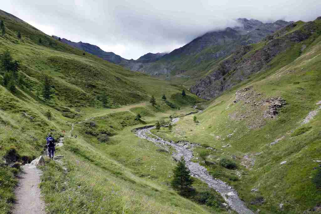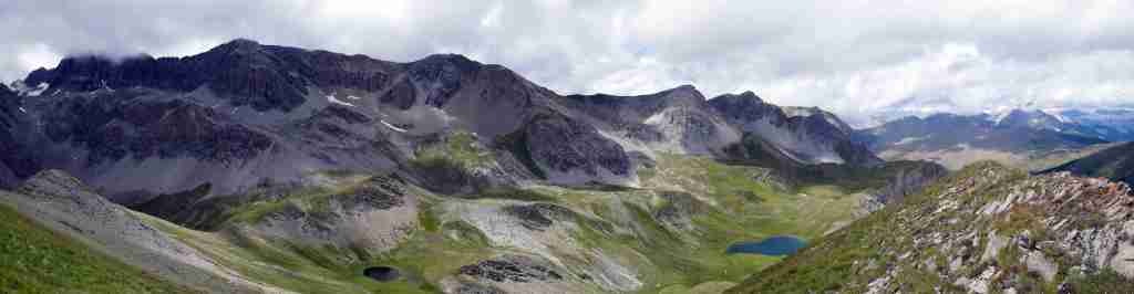 C’est de là que l’on peut entreprendre, par un aller-retour assez rapide mais relativement technique (beaucoup de pierres et peu d’indications), l’ascension du Pic du Vallon Crouzet cependant bien en vue. En face, respectivement à l’ouest et au sud, la Turge de la Suffie (3024 m) et le Pic de Rochebrune (3320 m) sont là. Plus loin, au nord, le Chaberton (3131 m) est bien visible aussi. Au pied, on peut admirer le petit lac des Maïts et un peu plus loin le plus généreux lac des Cordes. La redescente passe d’ailleurs auprès de ces deux lacs, avant de traverser un imposant massif de rhododendrons puis de rentrer en forêt, où un ressaut rocheux équipé d’une main courante nous attend.
