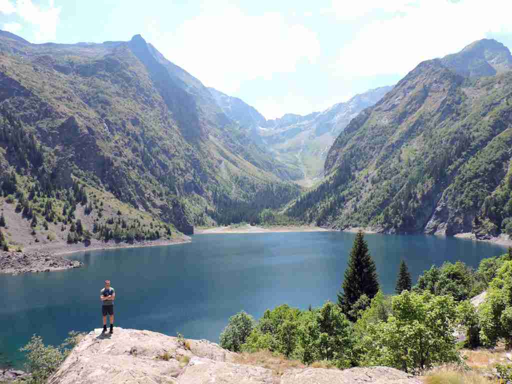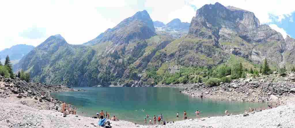 Au fur et à mesure que l’on monte, des vues s’ouvrent sur Les Deux Alpes, et même jusqu’au Pic Blanc (L’Alpe d’Huez), reconnaissable par la gare téléphérique construite à son sommet. On ne découvre le lac qu’une fois à proximité immédiate. Mais quelle récompense ! Entouré de beaux sommets verdoyants, ses rives côtoient la réserve intégrale du Lauvitel, la première du genre dans un parc national. D’un point de vue géologique, on peut facilement apercevoir l’éboulement rocheux qui a créé naturellement la retenue d’eau il y a environ 4000 ans.Massif : Ecrins