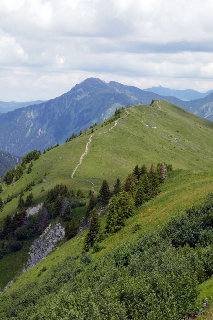 Puis, on bifurque plein est pour se diriger vers l’arête. La montée est relativement abrupte mais une fois en haut, la vue se dégage sur le cœur du Beaufortain (Pierra Menta, lac de Roselend…).