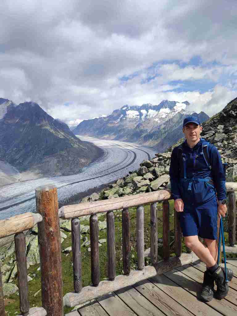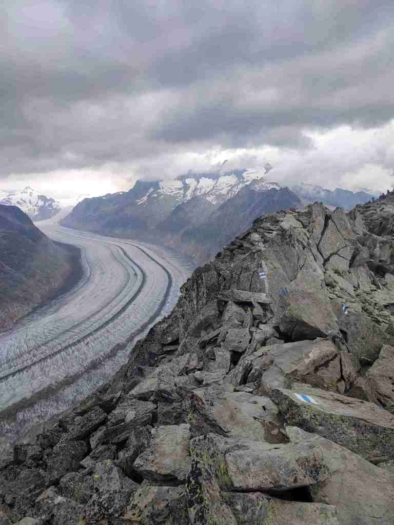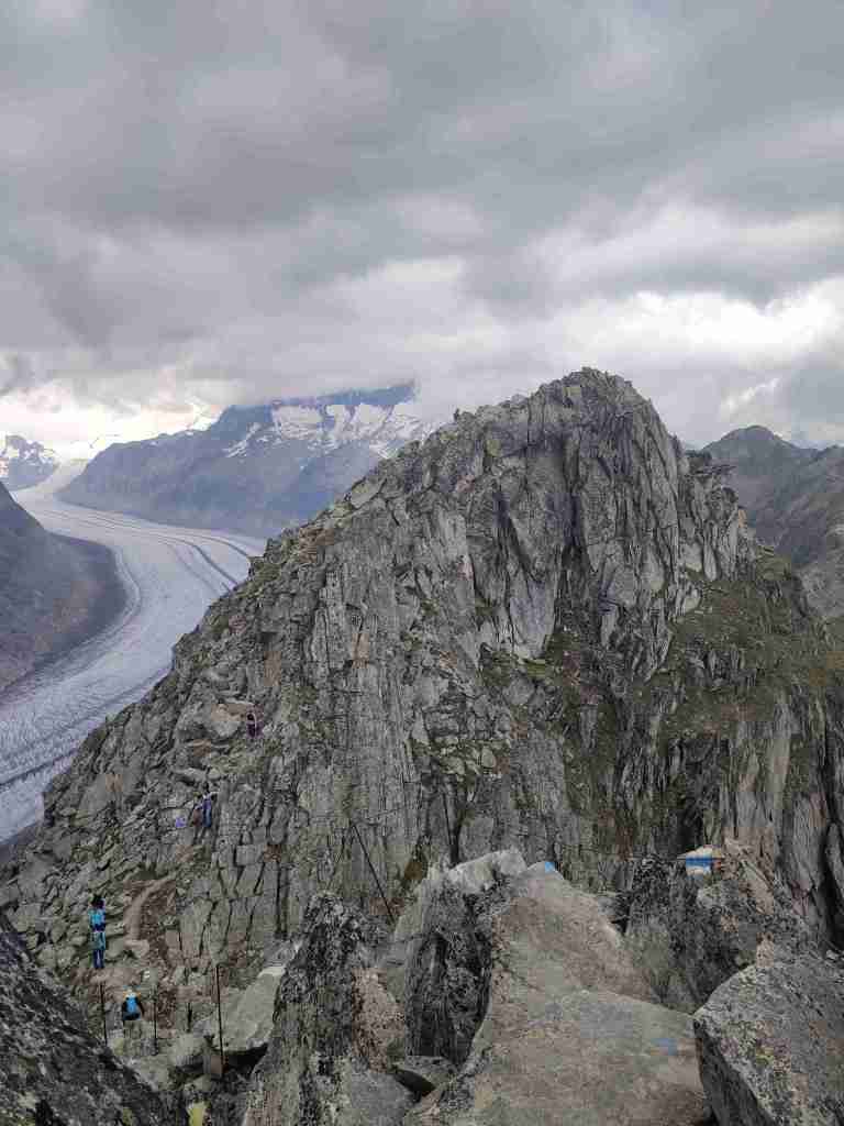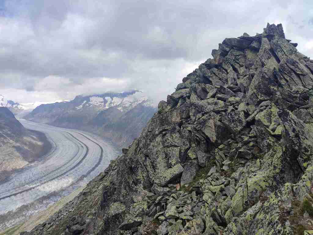 Au départ de la station de téléphérique de Bettmerhorn, pour démarrer, un petit détour de quelques minutes s’impose pour aller contempler le glacier depuis le célèbre point de vue situé à quelques encâblures. Après cela, il s’agit de remonter l’arête menant aux sommets de Bettmerhorn puis de Bettmergrat, et de la suivre jusqu’au col d’Elselicka. Cette section permet de longer le glacier situé plusieurs centaines de mètres en contrebas et de jouir de vues spectaculaires sur ce géant de glace. Mais son caractère « alpin » nécessite de mettre les mains à plusieurs reprises, c’est pourquoi je la déconseille aux personnes sujettes au vertige. Après le col d’Elselicka, le parcours, beaucoup plus roulant, rejoint le village sans voiture de Bettmeralp via le domaine skiable de la station.