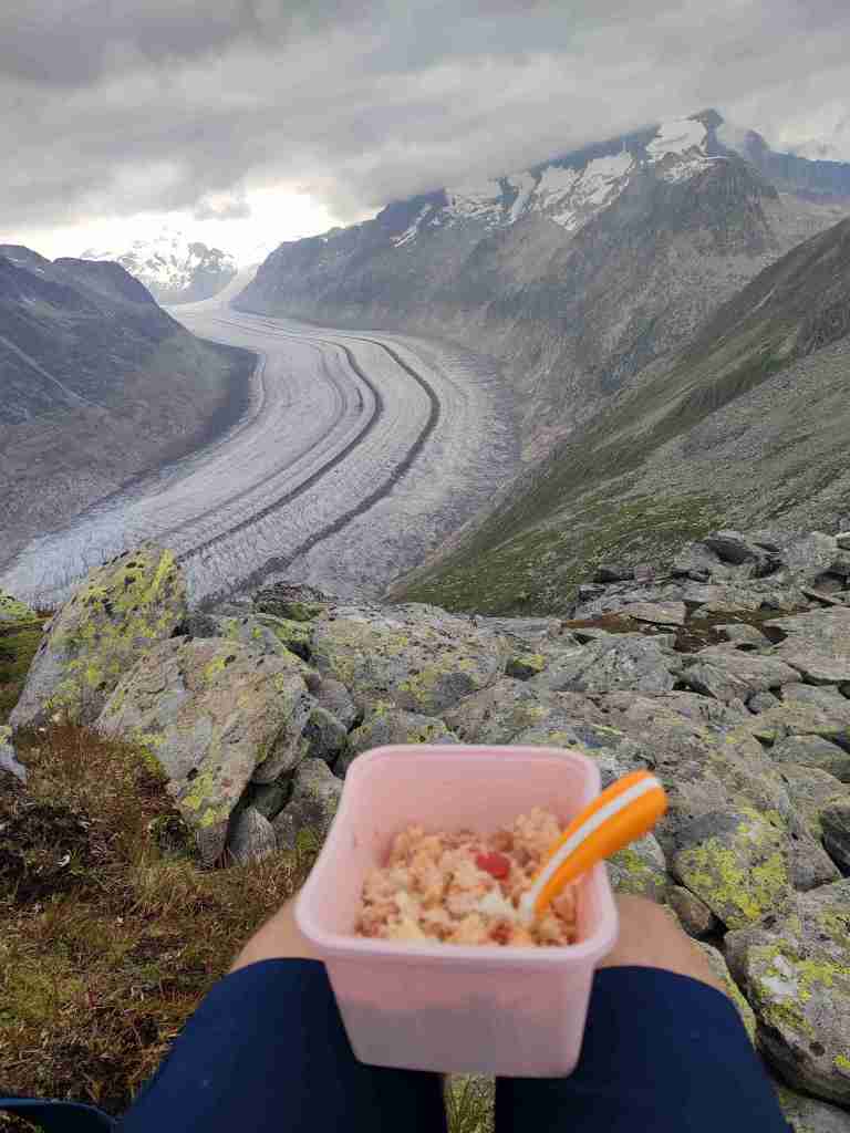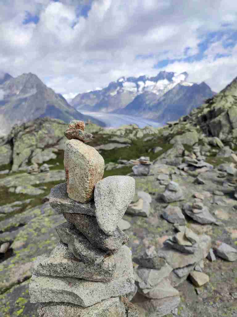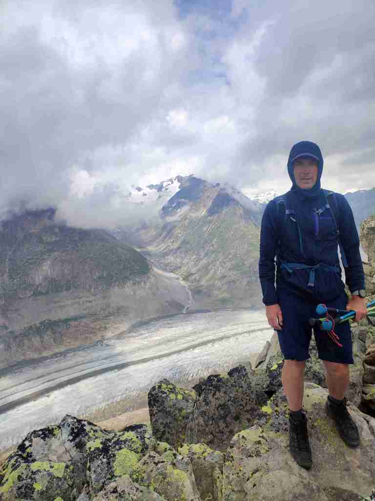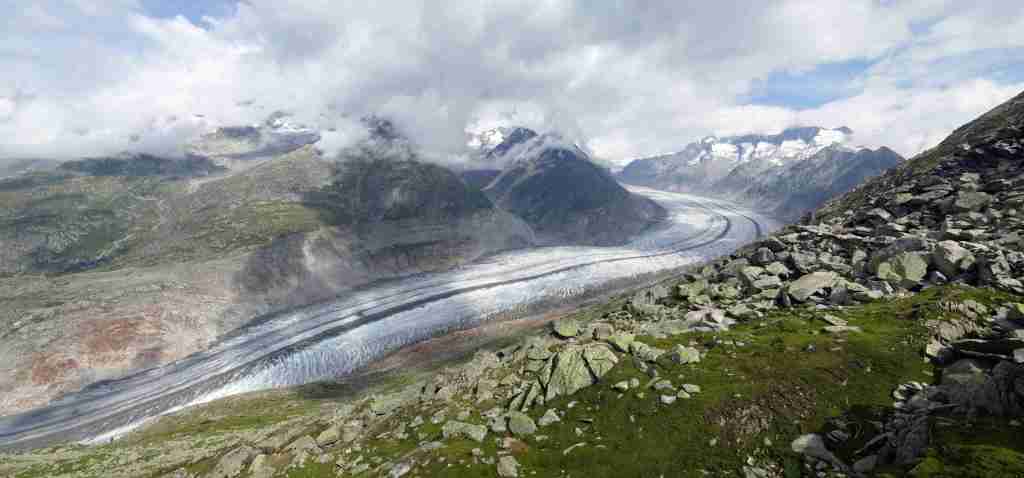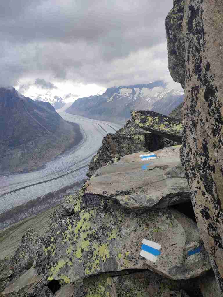 Au départ de la station de téléphérique de Bettmerhorn, pour démarrer, un petit détour de quelques minutes s’impose pour aller contempler le glacier depuis le célèbre point de vue situé à quelques encâblures. Après cela, il s’agit de remonter l’arête menant aux sommets de Bettmerhorn puis de Bettmergrat, et de la suivre jusqu’au col d’Elselicka. Cette section permet de longer le glacier situé plusieurs centaines de mètres en contrebas et de jouir de vues spectaculaires sur ce géant de glace. Mais son caractère « alpin » nécessite de mettre les mains à plusieurs reprises, c’est pourquoi je la déconseille aux personnes sujettes au vertige. Après le col d’Elselicka, le parcours, beaucoup plus roulant, rejoint le village sans voiture de Bettmeralp via le domaine skiable de la station.