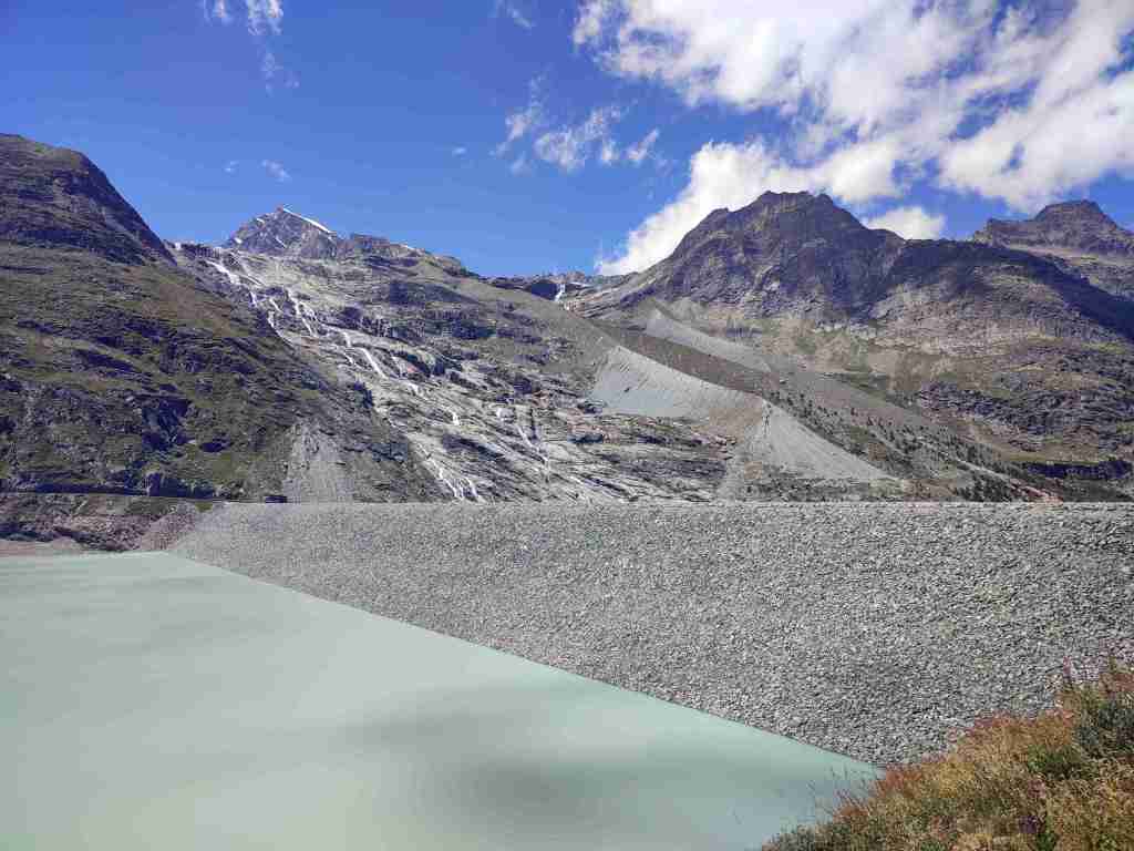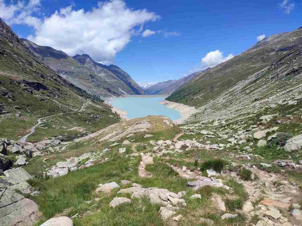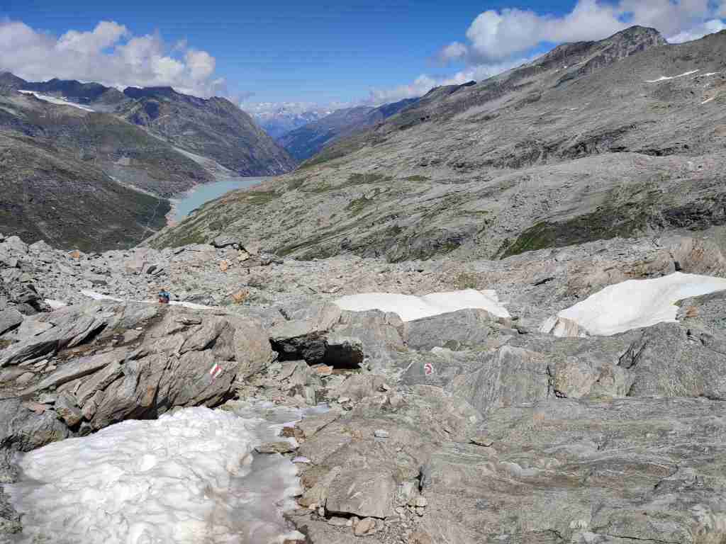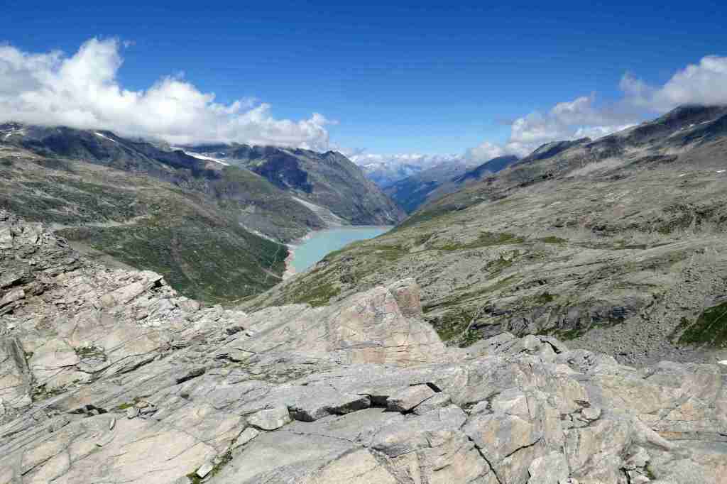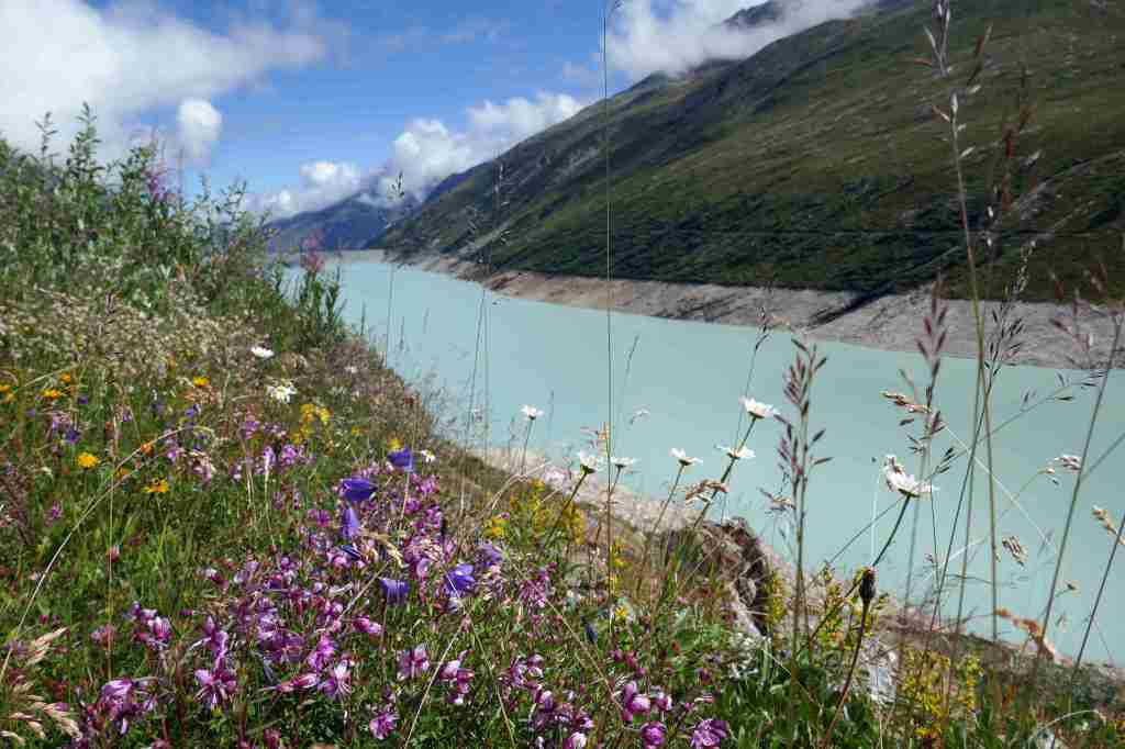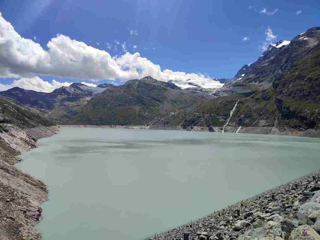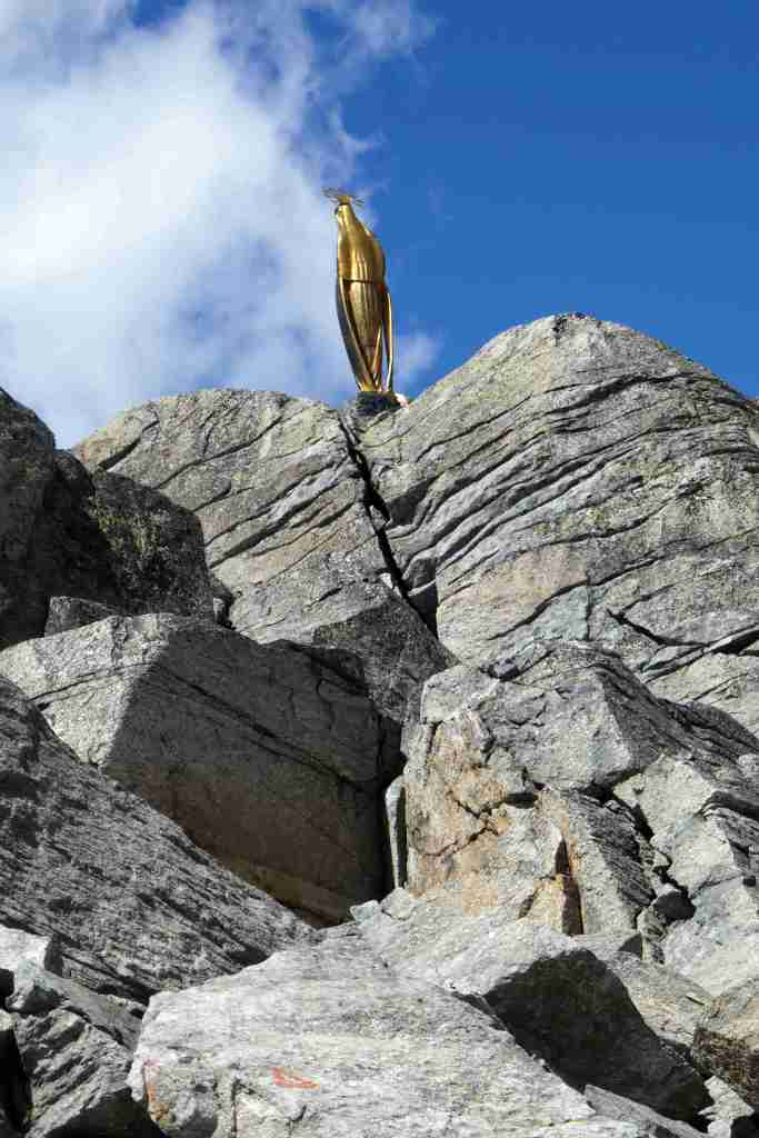 Le départ se fait au barrage de Mattmark. Il s’agit dans un premier temps de longer la rive ouest du lac sur environ 3,5 km, avec l’objectif bien en vue. Ensuite, le terrain s’élève quasiment plein sud jusqu’à atteindre un vaste secteur de replat nommé Tälliboden. Par la suite, on progresse essentiellement sur de grandes dalles polies jusqu’au col en tant que tel, où des mains courantes ont été installées pour parcourir les derniers mètres et atteindre la statue de la vierge dorée. Au sommet, le belvédère est impressionnant, notamment sur la face orientale du Mont Rose qui, avec ses 2 500 mètres, constitue tout simplement la plus grande face des Alpes ! Un défi de taille réservé aux alpinistes très chevronnés. Le retour se fait par la rive est du lac.