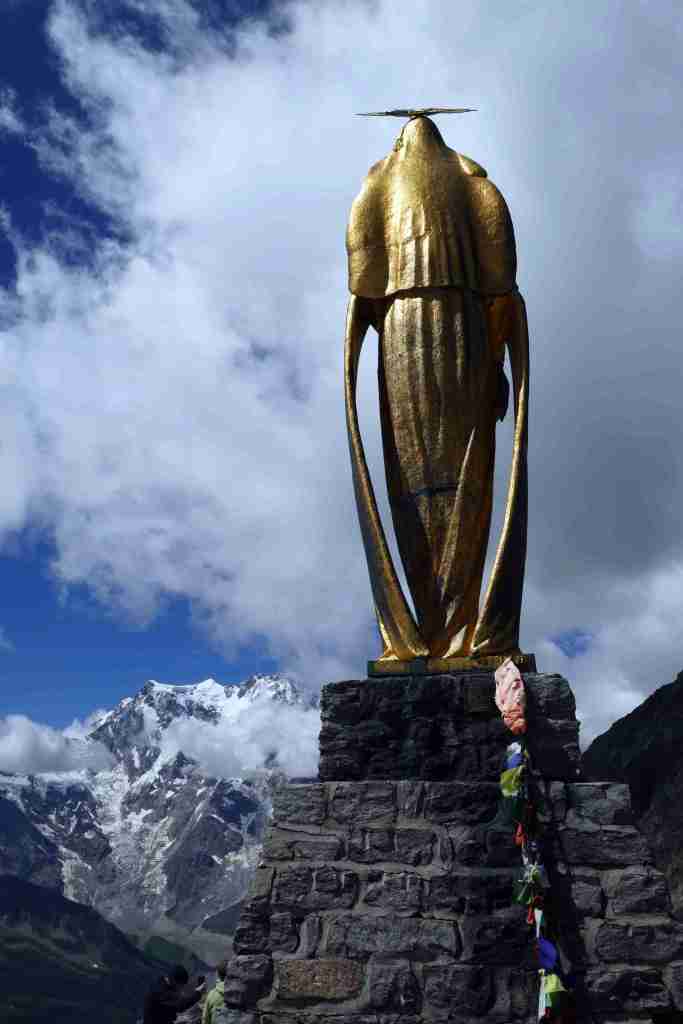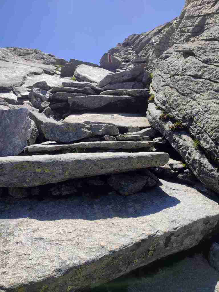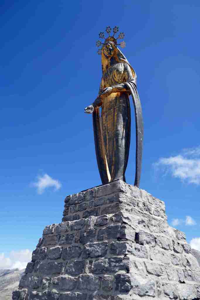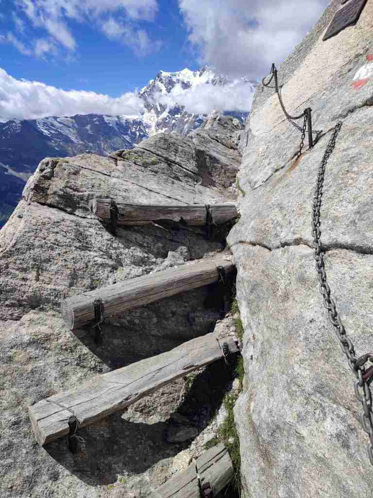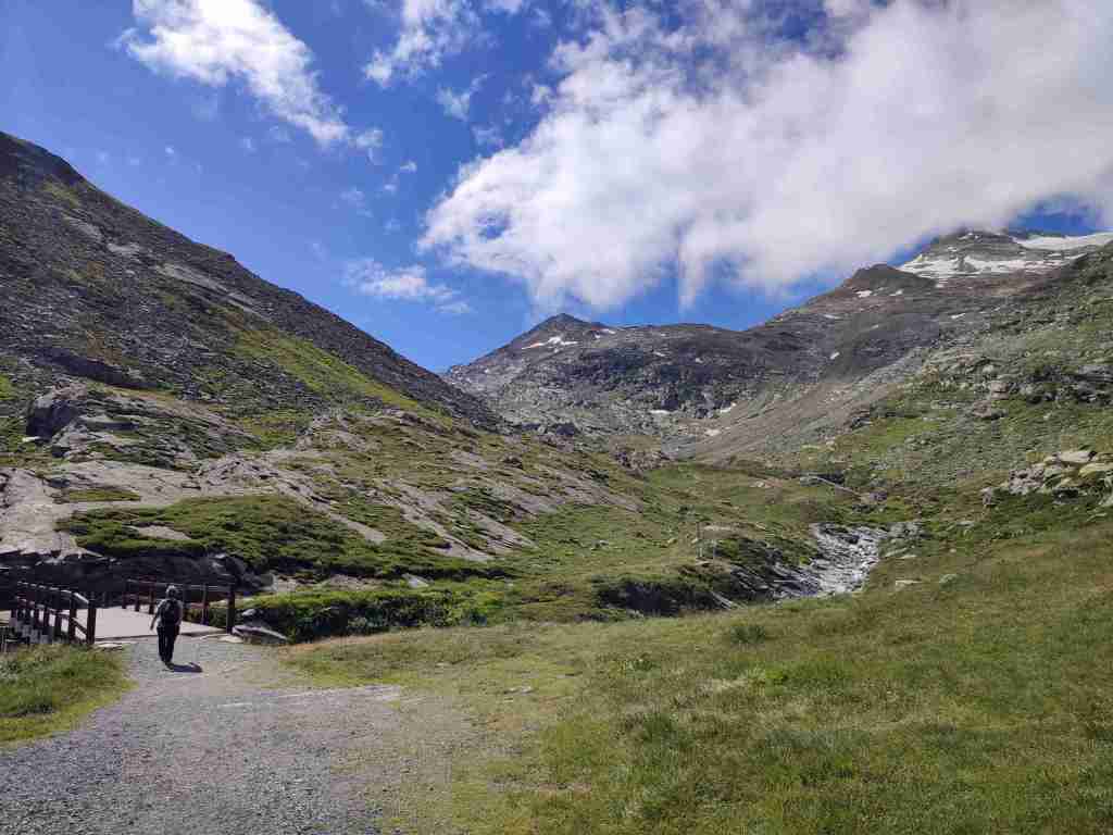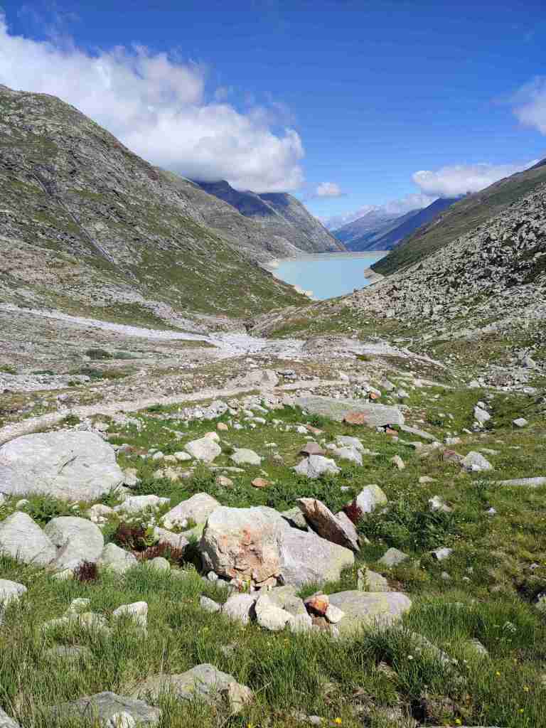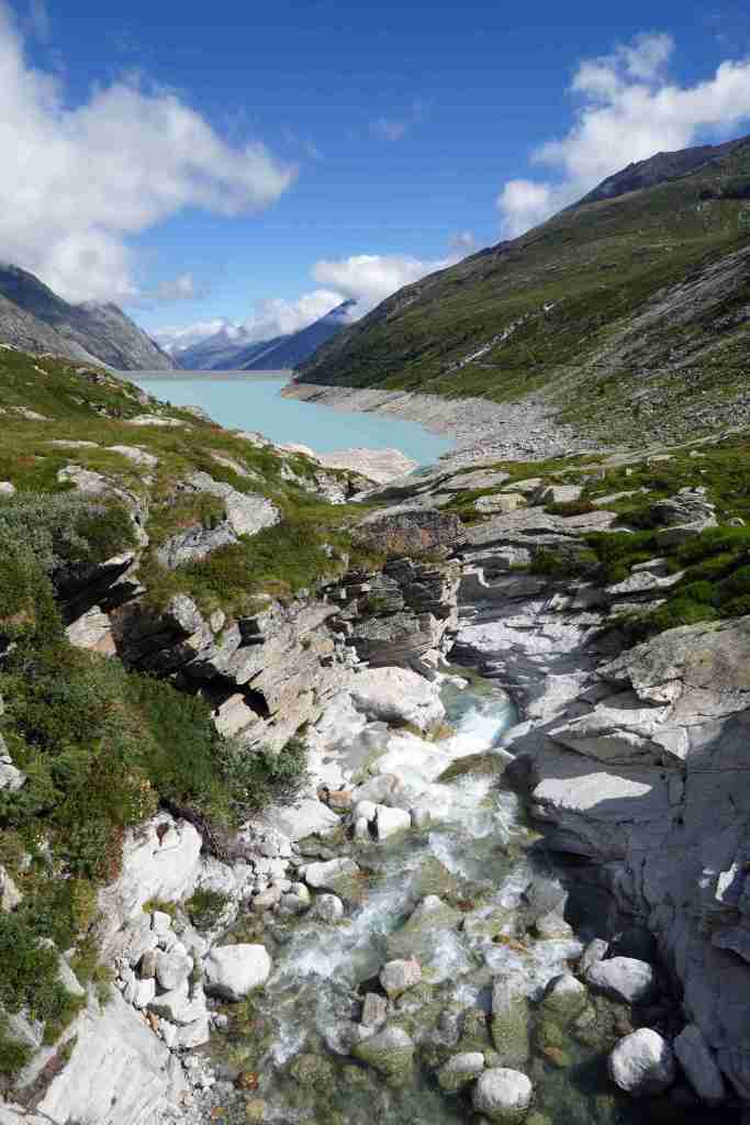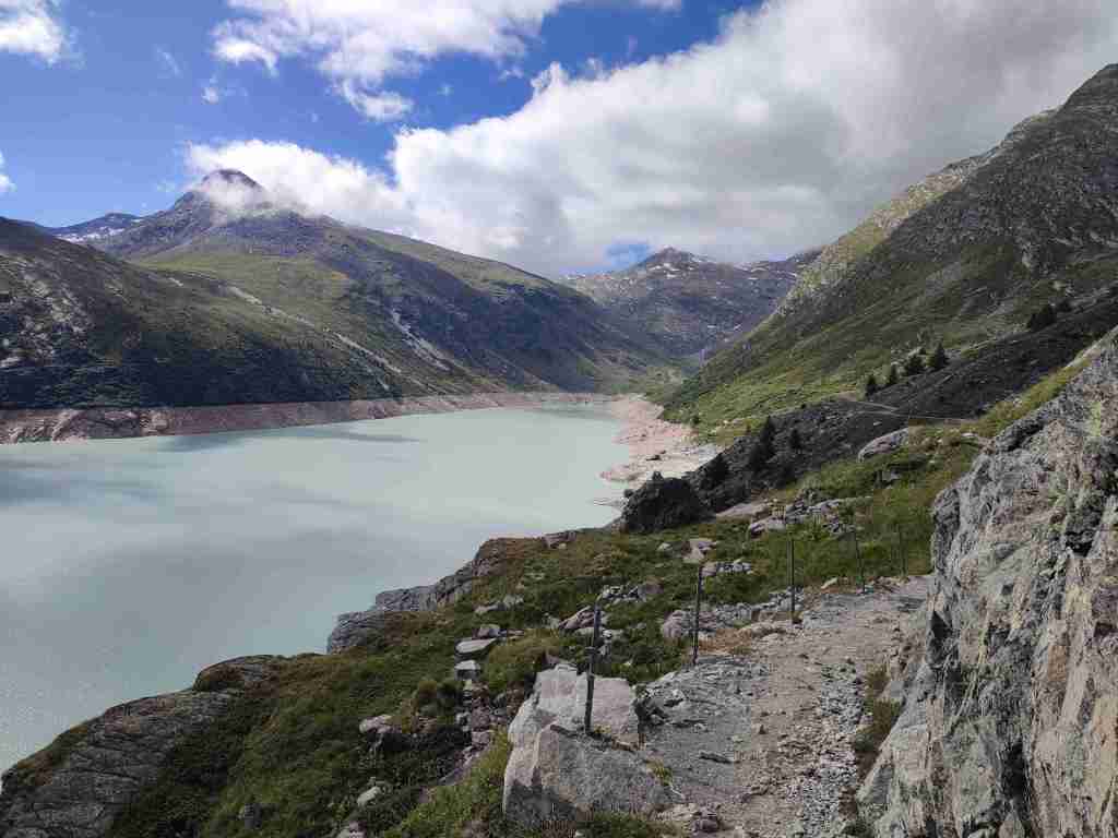 Le départ se fait au barrage de Mattmark. Il s’agit dans un premier temps de longer la rive ouest du lac sur environ 3,5 km, avec l’objectif bien en vue. Ensuite, le terrain s’élève quasiment plein sud jusqu’à atteindre un vaste secteur de replat nommé Tälliboden. Par la suite, on progresse essentiellement sur de grandes dalles polies jusqu’au col en tant que tel, où des mains courantes ont été installées pour parcourir les derniers mètres et atteindre la statue de la vierge dorée. Au sommet, le belvédère est impressionnant, notamment sur la face orientale du Mont Rose qui, avec ses 2 500 mètres, constitue tout simplement la plus grande face des Alpes ! Un défi de taille réservé aux alpinistes très chevronnés. Le retour se fait par la rive est du lac.