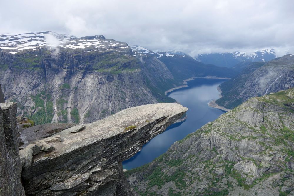 La fameuse Langue du Troll ne s’offre pas à n’importe qui : il faut s’acquitter d’une longue marche de 22 km A/R avec un gros raidillon d’emblée, dans un terrain souvent très humide, pour espérer apercevoir cette pointe rocheuse en équilibre précaire.