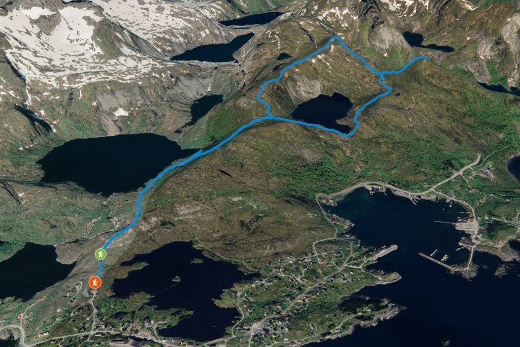 Dans un premier temps, il s’agit de rejoindre le lac de Stuvdalsvatnet, puis de le longer par sa rive est. Arrivé à l’extrémité nord-est du lac, on bifurque vers le nord-est en attaquant un petit raidillon qui débouche sur les abords du lac de Moskenesvatnet. Pour atteindre Merraflestinden, il faut ensuite prendre plein nord, où d’emblée une petite bosse se présente face à nous. Une fois passée, le sommet est bien visible, le chemin évident et assez facile. D’en haut, la vue s’ouvre à l’est sur le Djupfjord et le pont sur l’E10, qui relie Reine à Moskenes. Le sommet de Gylltinden, qui semble presque inaccessible tant il est acéré, est également bien en vue, surplombant ce fjord de plus de 500 m. Pour y parvenir, il faut redescendre en direction du sud-est jusqu’au col situé à environ 320 m. L’ascension est raide, notamment dans la dernière partie où il faut mettre les mains par endroits. Au sud, les ports de Moskenes et Sørvågen paraissent tout près. Après être redescendu par le même chemin jusqu’au col, la fin du parcours, parfois hasardeuse le long du lac de Moskenesvatnet, contourne par le nord le sommet de Kollfjellet (qui peut être gravi) puis rejoint la même trace qu’à l’aller. A noter que la boucle fait le tour du lac dans le sens des aiguilles d’une montre, mais l’inverse est bien entendu possible.Type : randonnée