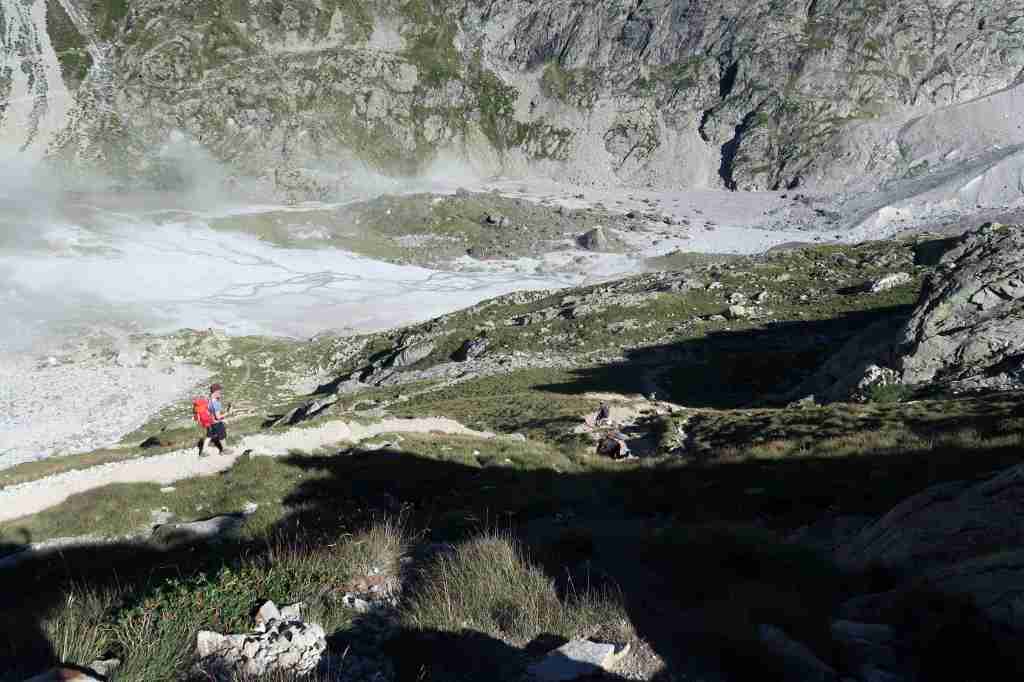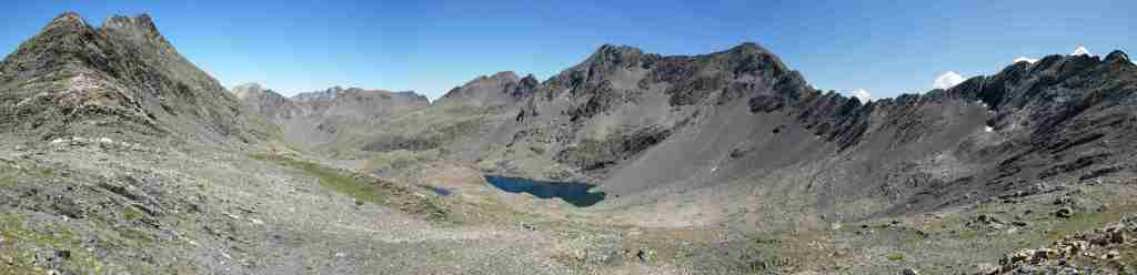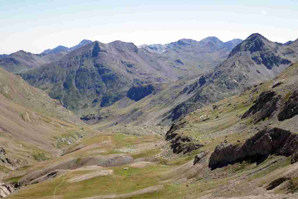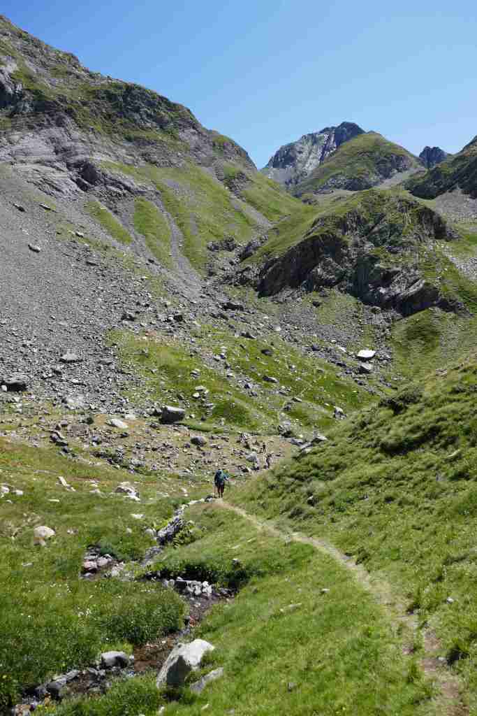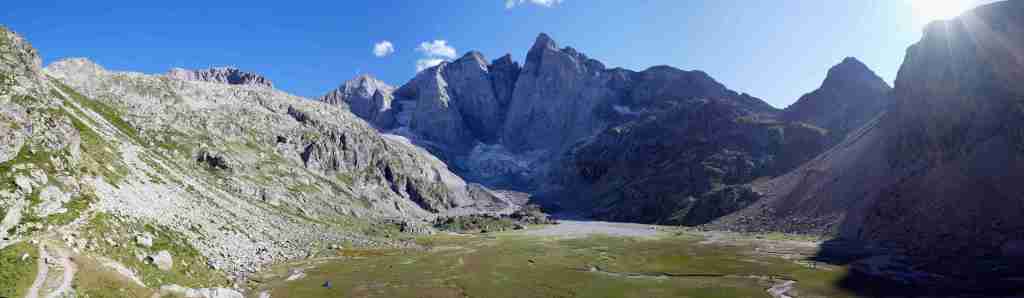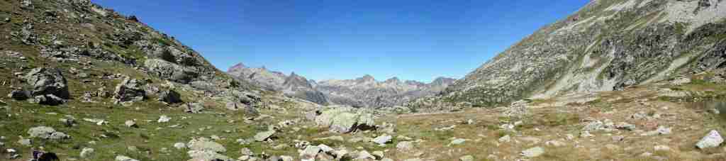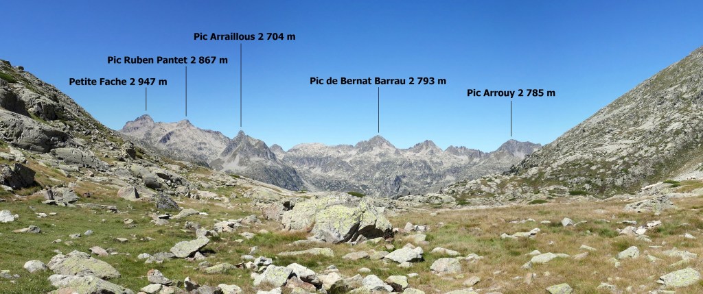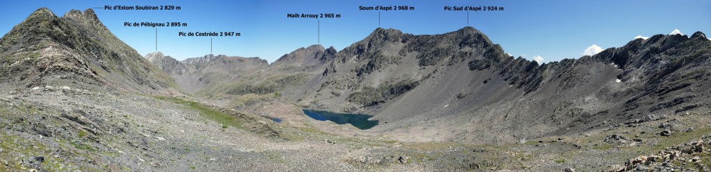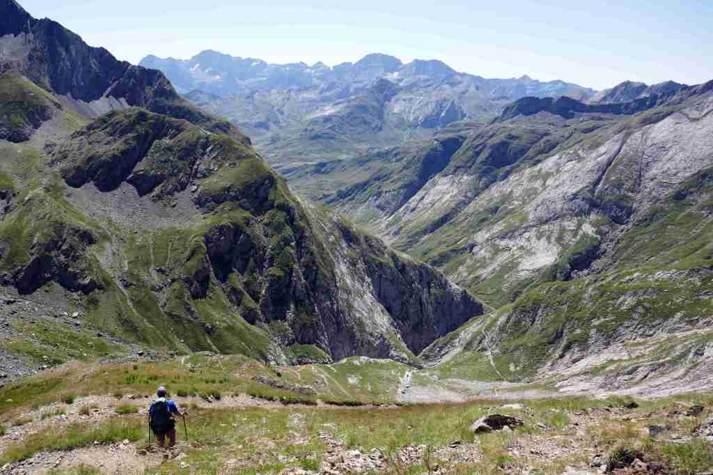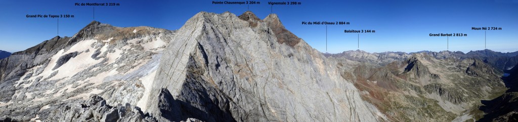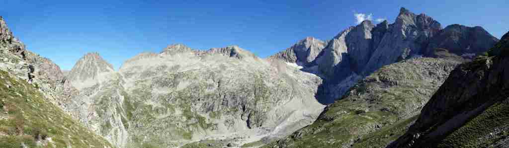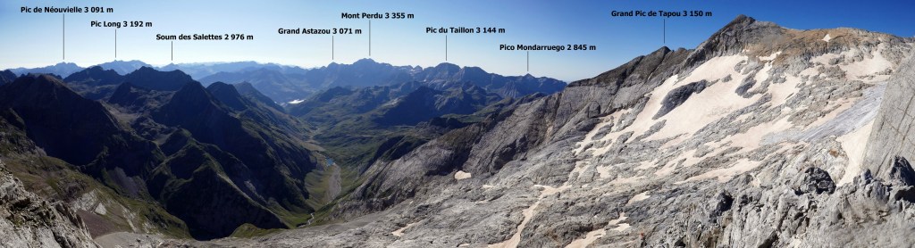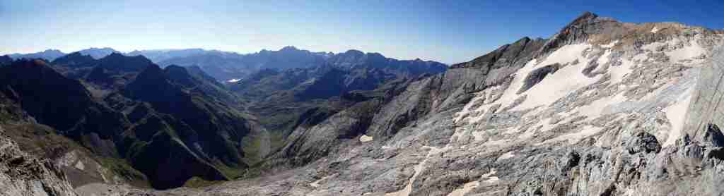 Au sud, se découvre le plus grand glacier des Pyrénées après celui de l’Aneto, le glacier d’Ossoue. La vue embrasse une belle partie des Pyrénées : du Pic du Midi d’Ossau à l’ouest (à 25 km à vol d’oiseau) au secteur de Gavarnie à l’est (brèche de Roland, Marboré, Taillon…). Ensuite, l’itinéraire passe devant le refuge de Bayssellance et les grottes de Bellevue, avant de se diriger plein est, dans un long raidillon, vers le lac des Gentianes et le col éponyme. Reste une très longue descente qui démarre par le lac Glacé puis qui emprunte le sentier d’Estom Soubiran. Le passage entre les lacs de Labas et des Oulettes d’Estom Soubiran est mémorable. Attention, le sentier qui suit le Gave d’Estom Soubiran jusqu’au bout est délicat sur ses derniers hectomètres, il est préférable de suivre la trace qui mène au sentier d’Arraillé.
