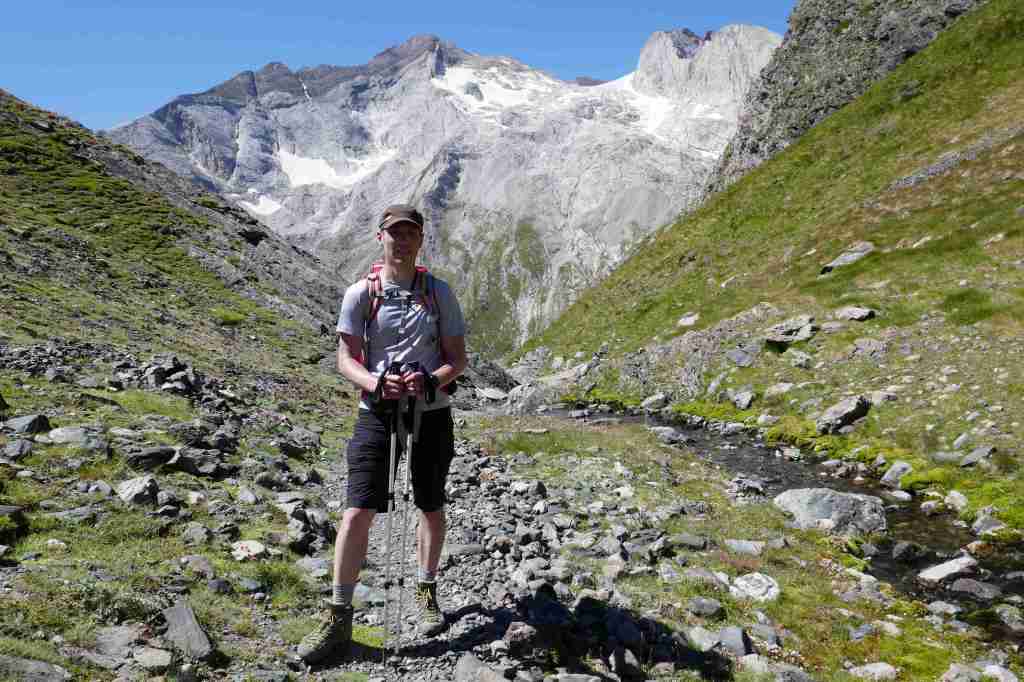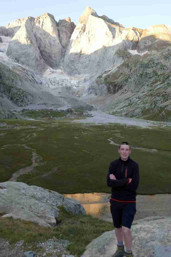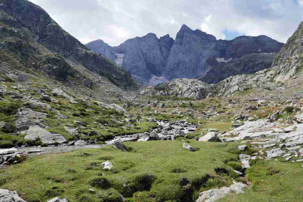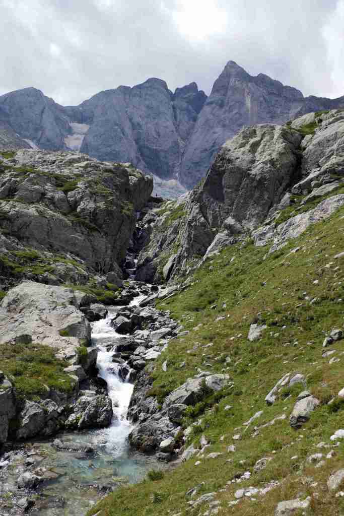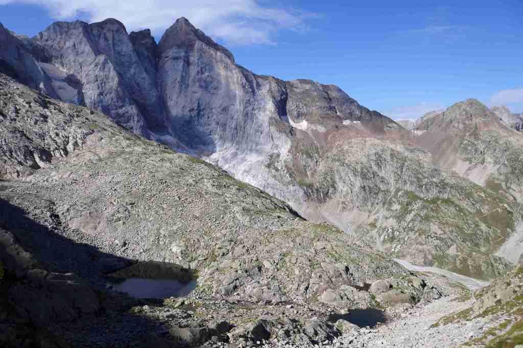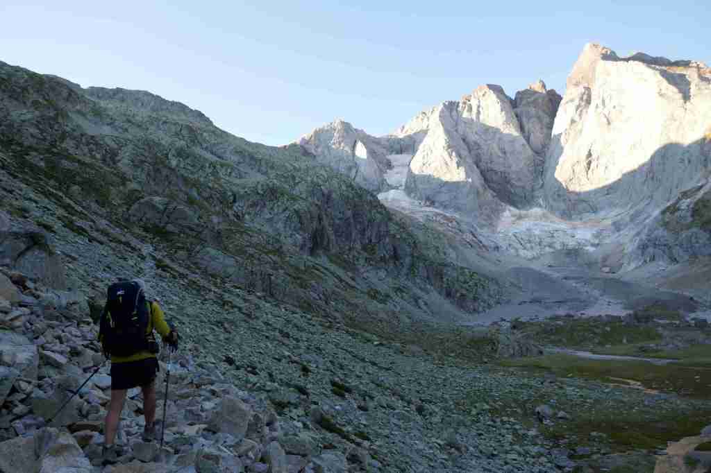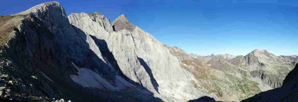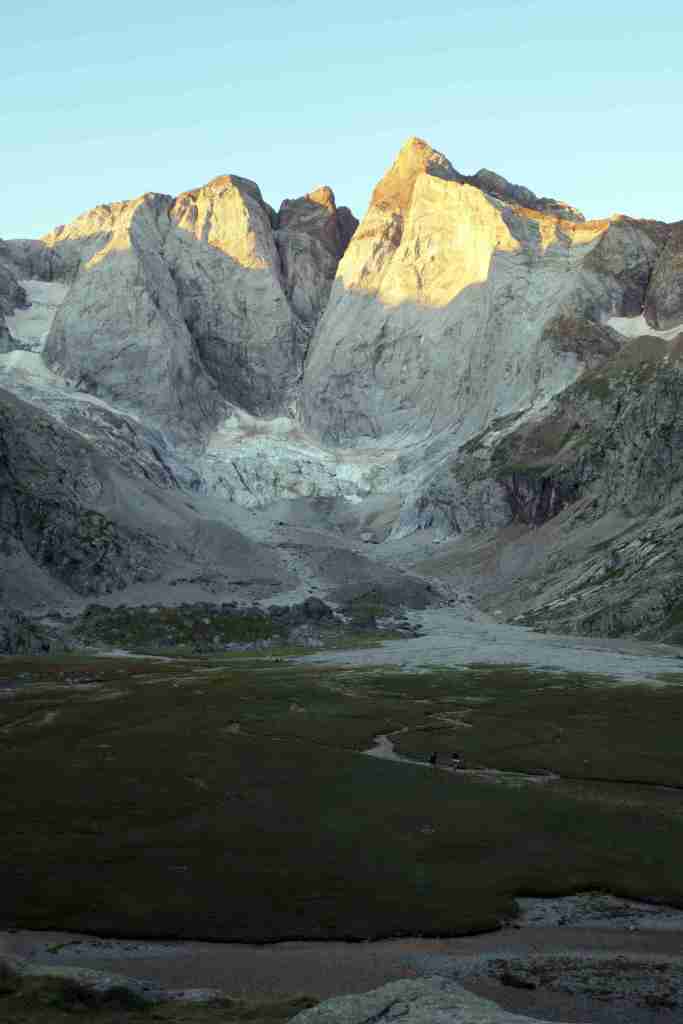 D’ici, on aperçoit le prochain col, celui des Mulets, en contrebas de la Pique Longue du Vignemale, point culminant des Pyrénées françaises. Pour l’atteindre, il nous faut traverser un petit morceau d’Espagne, le « Circo del Ara ». La fin de cette première étape s’apparente à une longue descente jusqu’au refuge des Oulettes de Gaube, lové au pied de la fameuse face nord. Extraordinaire.